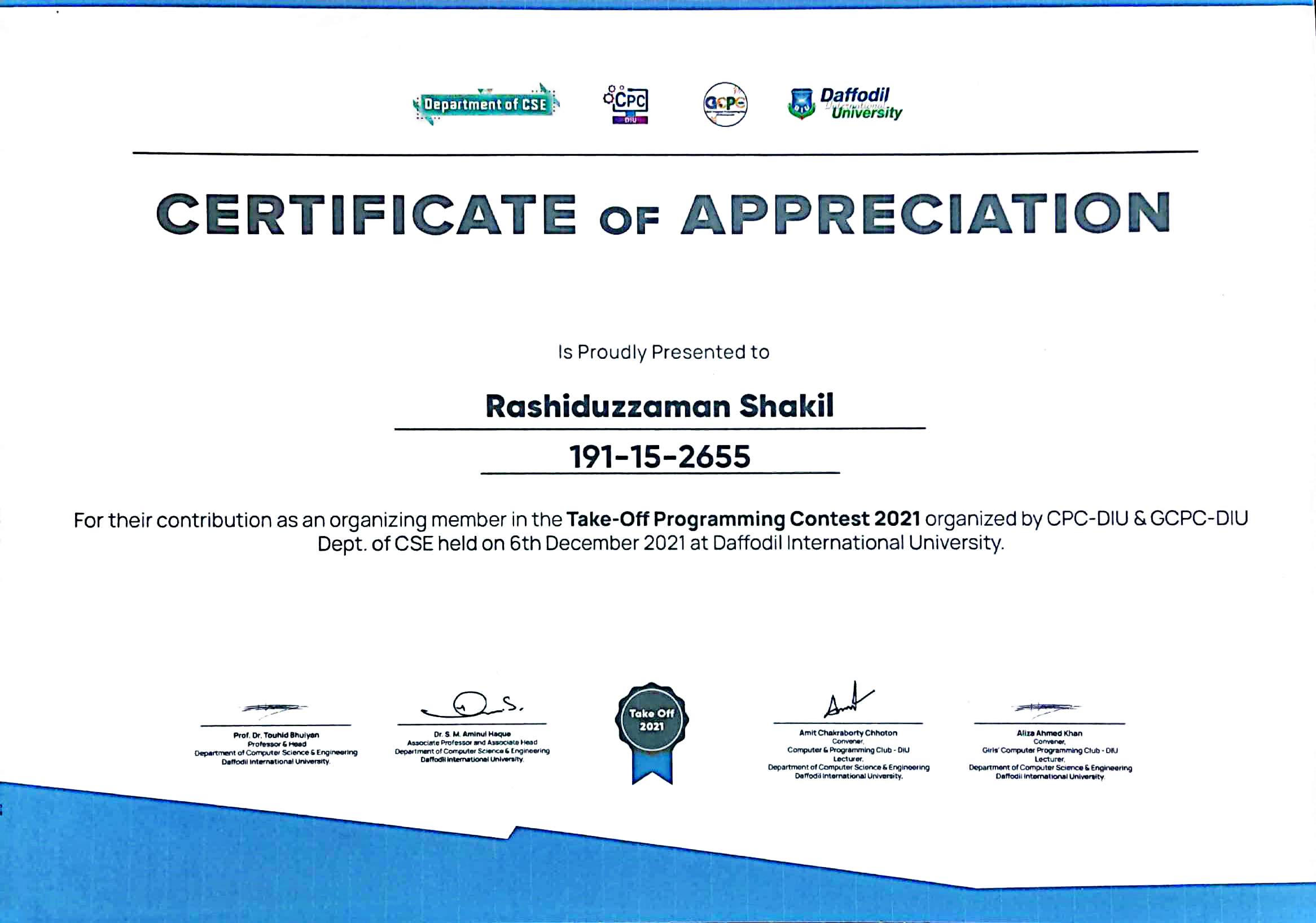 This certificate was achieved for the contribution of an organizing member in the Take-off Programming Contest 2021. The contest was organized by the DIU CPC (Computer and Programming Club) & GCPC (Girls Computer and Programming Club) and held on 6th December 2021.