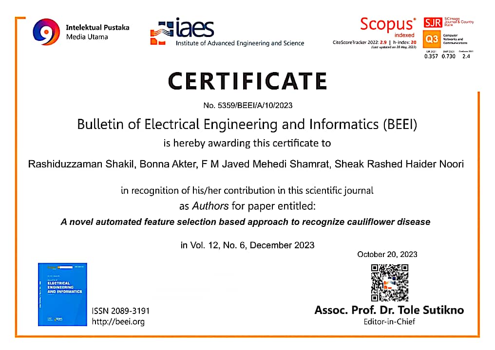 - R. Shakil, B. Akter, F. M. J. M. Shamrat, S. R. H. Noori, A Novel Automated Feature Selection Based Approach to Recognize Cauliflower Disease, Bulletin of Electrical Engineering and Informatics, vol. 12, pp. 3541–3551, Dec. 2023. DOI: 10.11591/eei.v12i6.5359