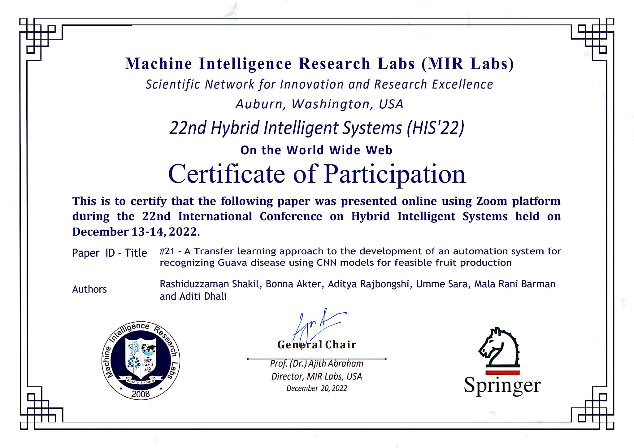 "A Transfer learning approach to the development of an automation system for recognizing Guava disease using CNN models for feasible fruit production" presented in 22nd Hybrid Intelligent systems (HIS' 22).