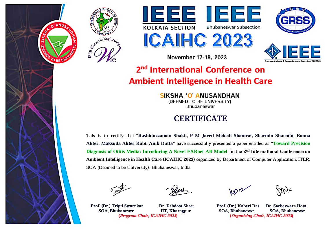 "Toward Precision Diagnosis of Otitis Media: Introducing A Novel EARnet-AR Model" paper presentation in 2nd International Conference on Ambient Intelligence in Healthcare (ICAHC-2023).
