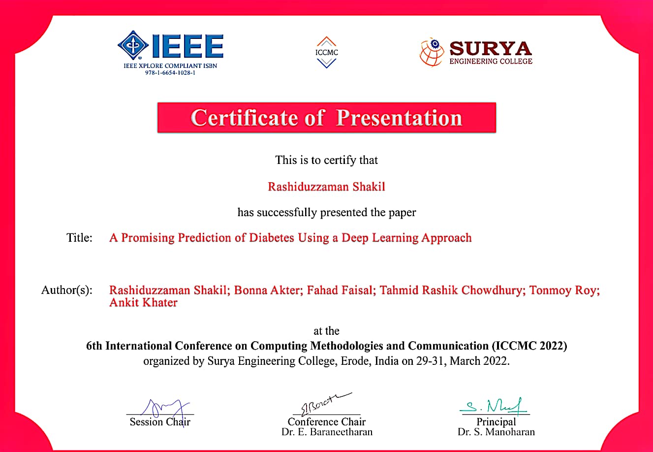 "A Promising Prediction of Diabetes Using a Deep Learning Approach" paper presentation in 6th International Conference on Computing Methodologies and Communication(ICCMC 2022).