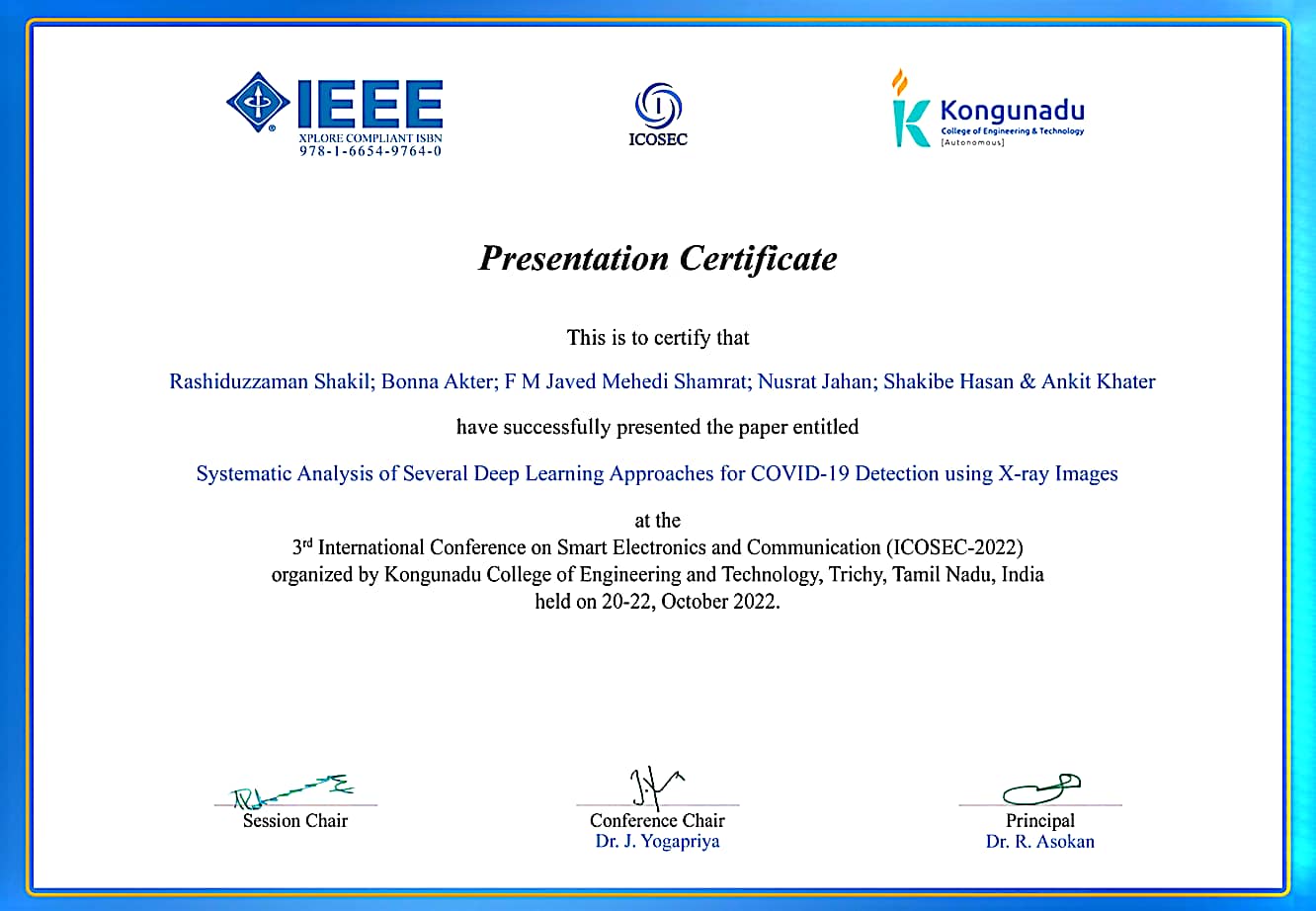 "Systematic Analysis of Several Deep Learning Approaches for COVID-19 Detection using X-ray images" paper presentation in 3rd International Conference on Smart Electronics and Communication (ICOSEC-2022).
