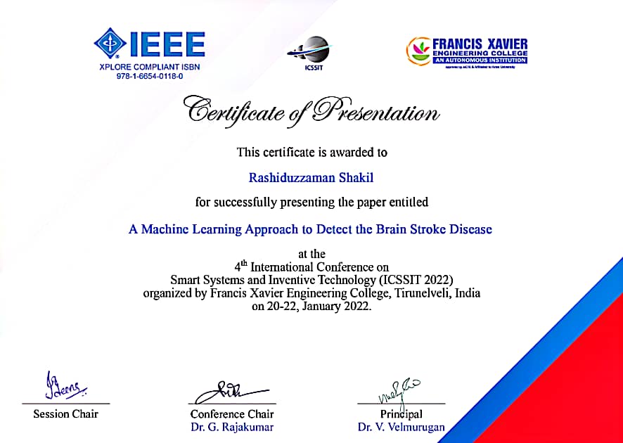 "A Machine Learning Approach to Detect the Brain Stroke Disease" paper presentation in 4th International Conference on Smart Systems and Inventive Technology (ICSSIT 2022).