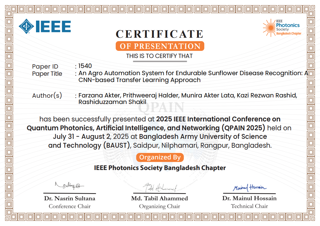 "An Agro Automation System for Endurable Sunflower Disease Recognition: A CNN-based Transfer Learning Approach" paper presentation in 2025 IEEE International Conference on Quantum Photonics, Artificial Intelligence, and Networking (QPAIN 2025).