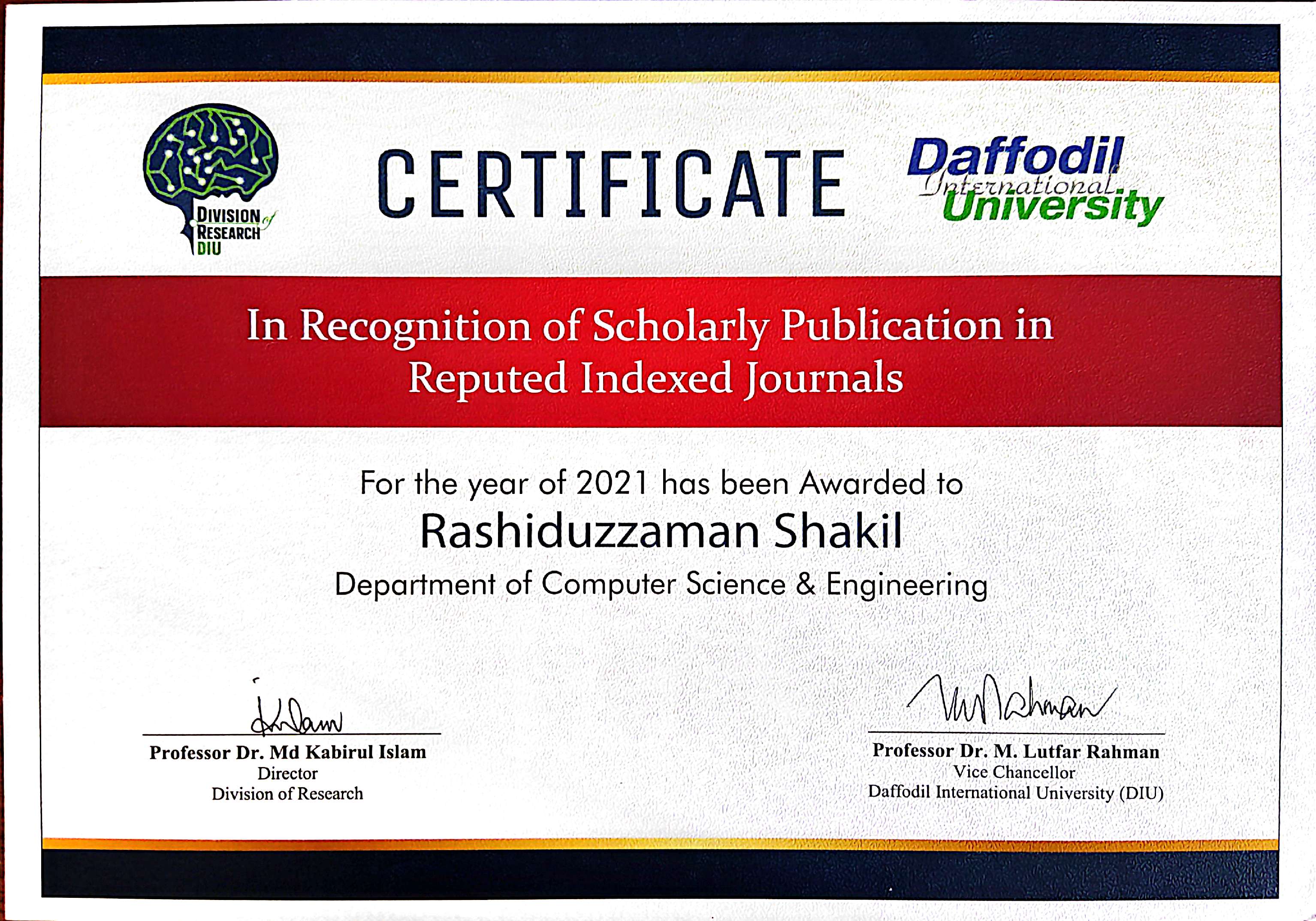 Research Award-2021 for scholarly publication in scopus index journals. This award ceremony was arranged by Daffodil International University.