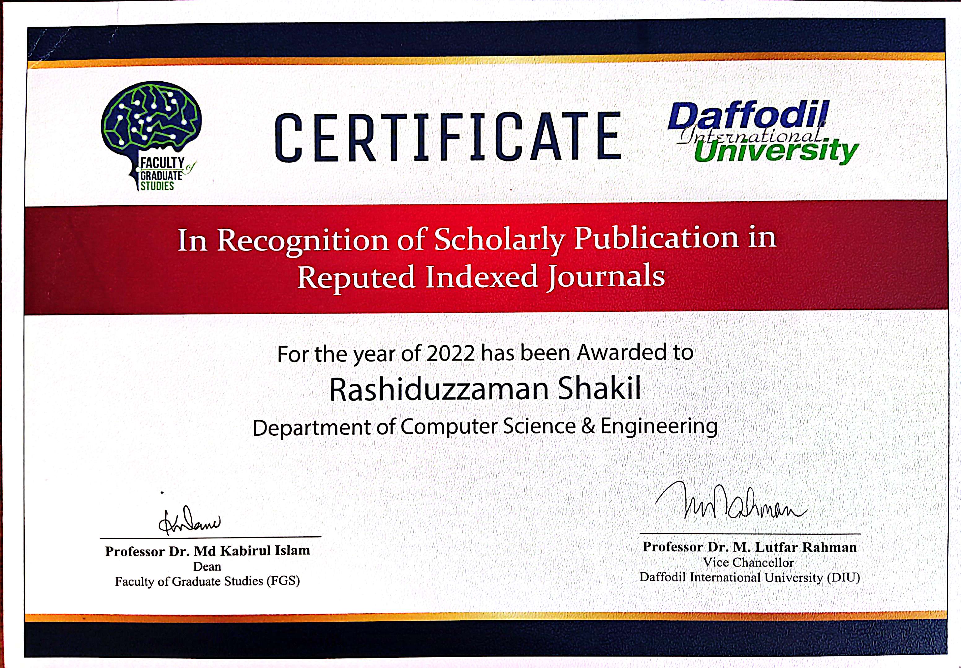 Research Award-2022 for scholarly publication in scopus index journals. This award ceremony was arranged by Daffodil International University.