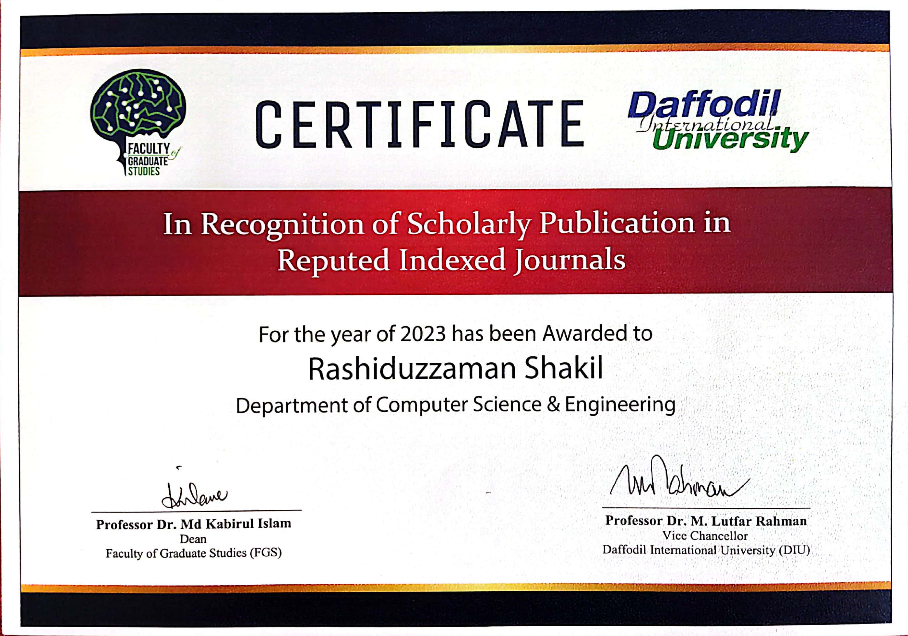 Research Award-2023 for scholarly publication in scopus index journals. This award ceremony was arranged by Daffodil International University.
