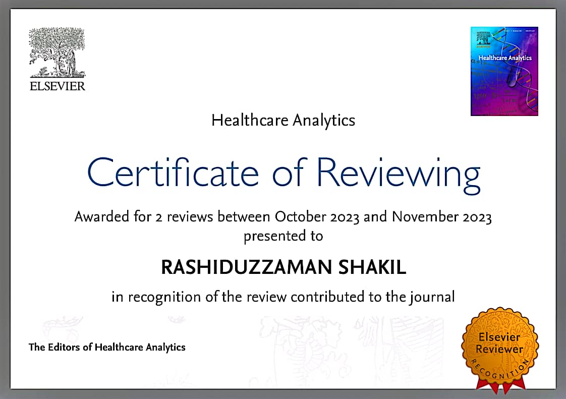 Reviewer in Halthcare Analytics Journal: I have been play a role of a Reviewer in Healthcare Analytics Journal and successfully reviewed two (2) article.