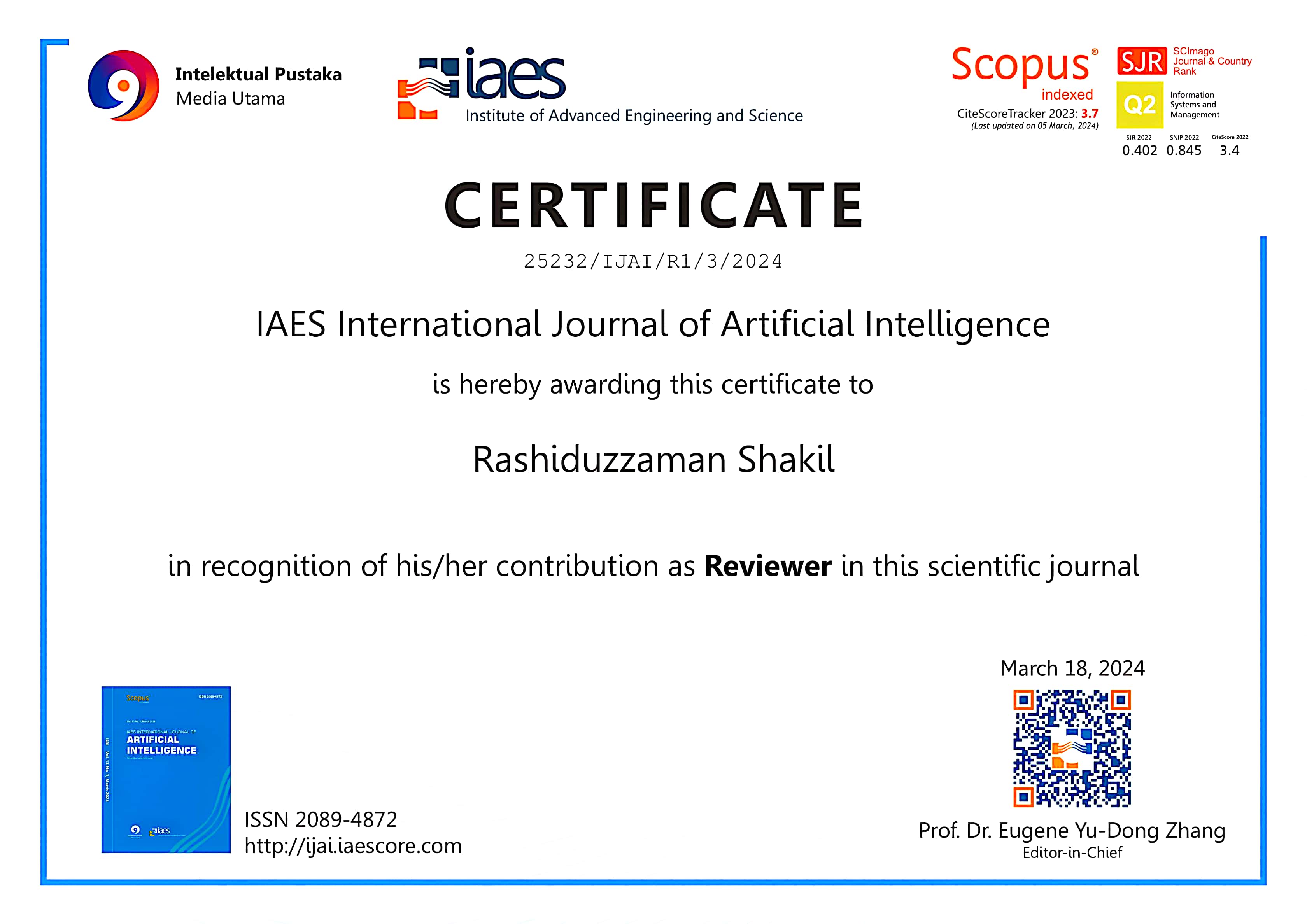 Reviewer in IJ-AI Journal: I have been play a role of a Reviewer in IAES International Journal of Artificial Intelligence and successfully reviewed one (1) article.