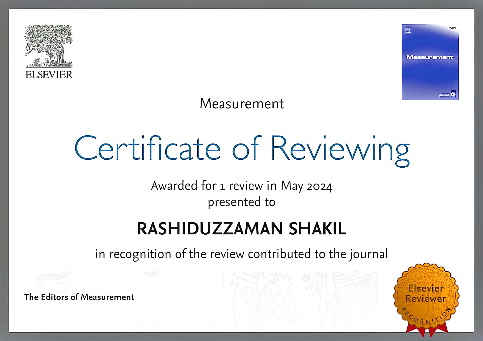 - Reviewer in Measurement journal and reviewed one (1) article.